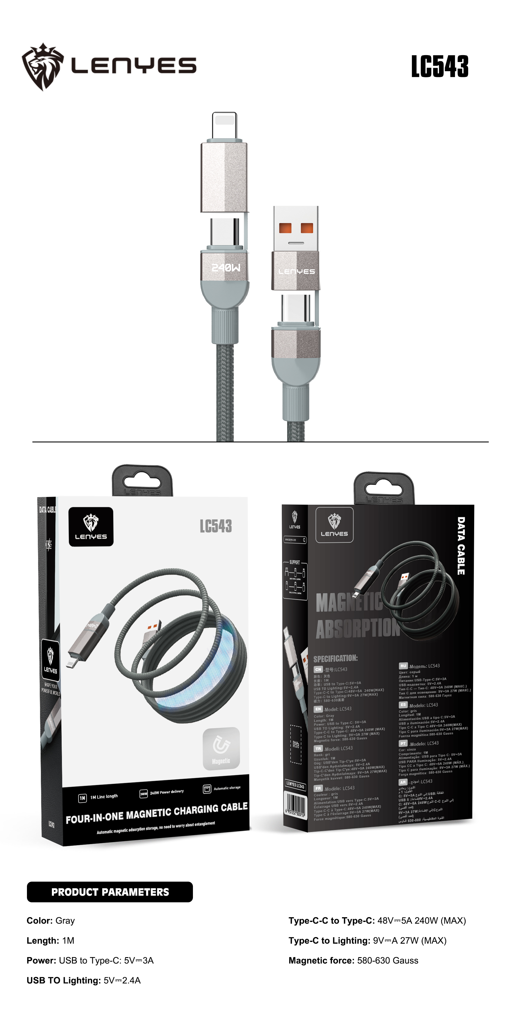 Lenyes LC543 | 4in1 240W Fast Charging USB-A & Type-C Cable | Digital Display