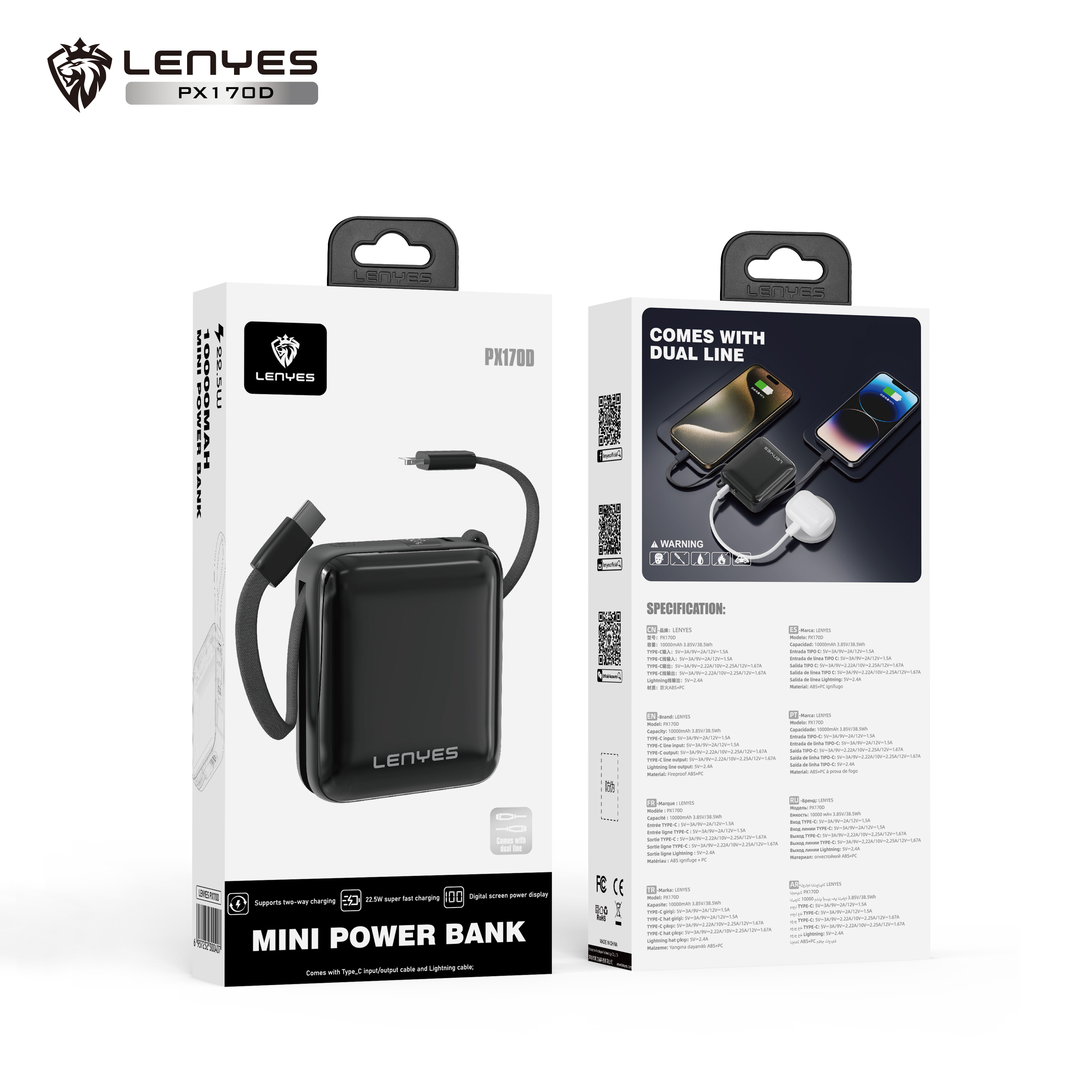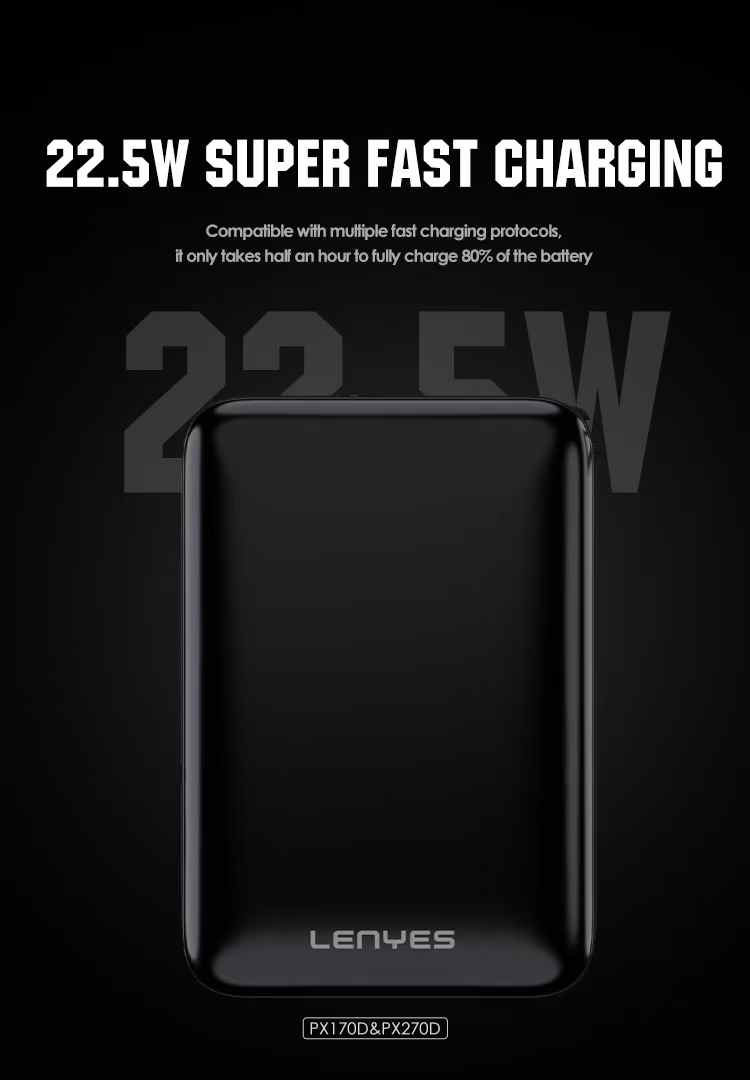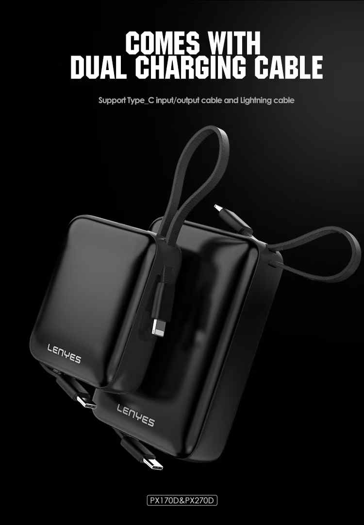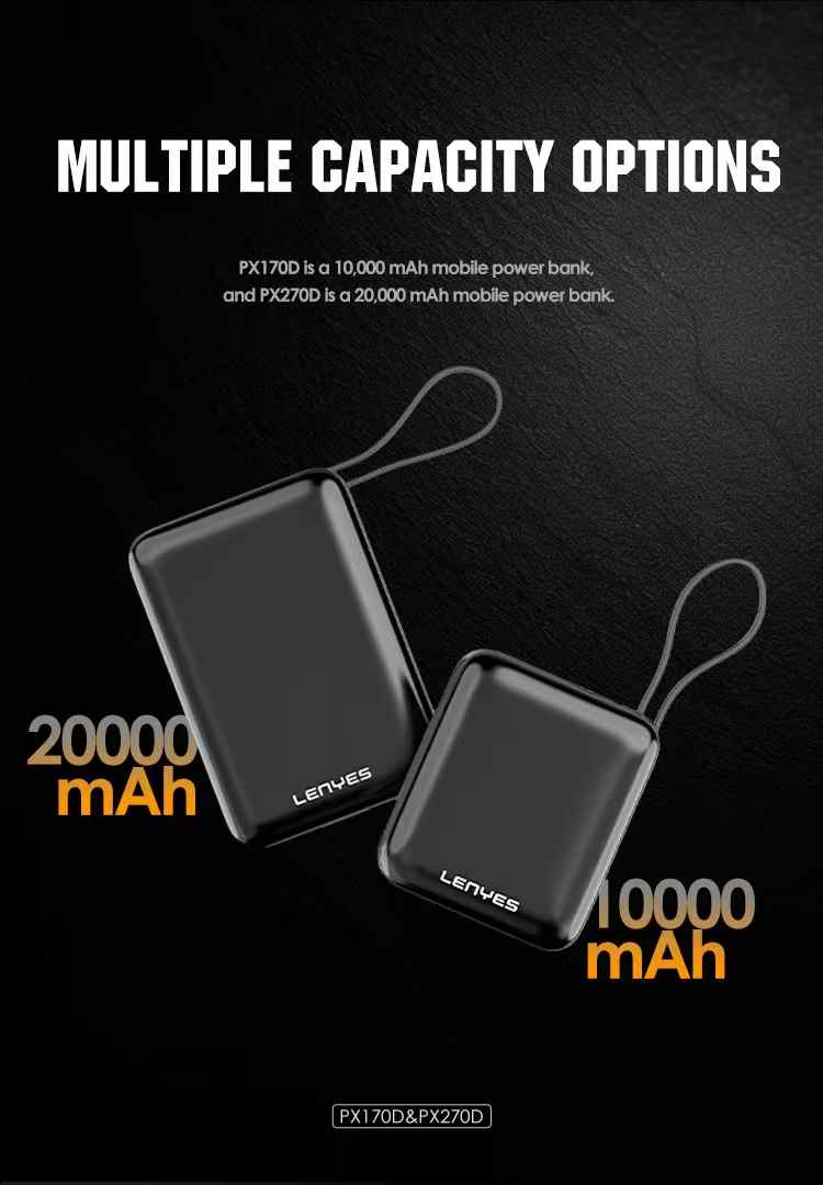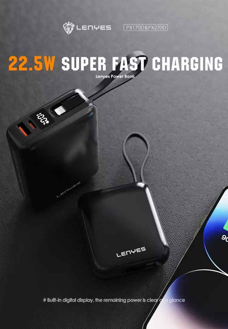 Meet the Lenyes PX170D — an ultra-compact yet incredibly powerful 10,000mAh power bank crafted to match the pace of today’s dynamic lifestyles. Whether you’re traveling, commuting, working remotely, or managing a busy day on the go, the PX169D ensures you’re never without reliable power. Despite its minimal form factor that comfortably fits in the palm of your hand or slips effortlessly into your pocket or bag, this mini powerhouse delivers a robust 20W Type-C fast charging output. It supports Power Delivery (PD) to quickly recharge your smartphones, tablets, wireless earbuds, and other USB-C-enabled devices with maximum efficiency. The built-in Type-C cable means you’re always ready to charge — no more worrying about forgetting or untangling extra wires. With its dual Type-C input/output port, the power bank recharges just as quickly as it charges your devices, ensuring minimal downtime. One of its most convenient features, pass-through charging, allows the PX170D to charge itself while powering another device simultaneously — ideal for multitaskers and overnight charging setups. The intuitive LED digital display provides a clear battery percentage reading at a glance, so you always know how much power remains. A dedicated wake-up button activates the display and charging status instantly, even when the device is idle. With a premium finish and four vibrant color options to choose from, the PX169D not only delivers top-tier functionality but also adds a touch of personal style to your everyday tech.